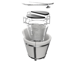 • een hoge RVS kolenmand met verdeelschot